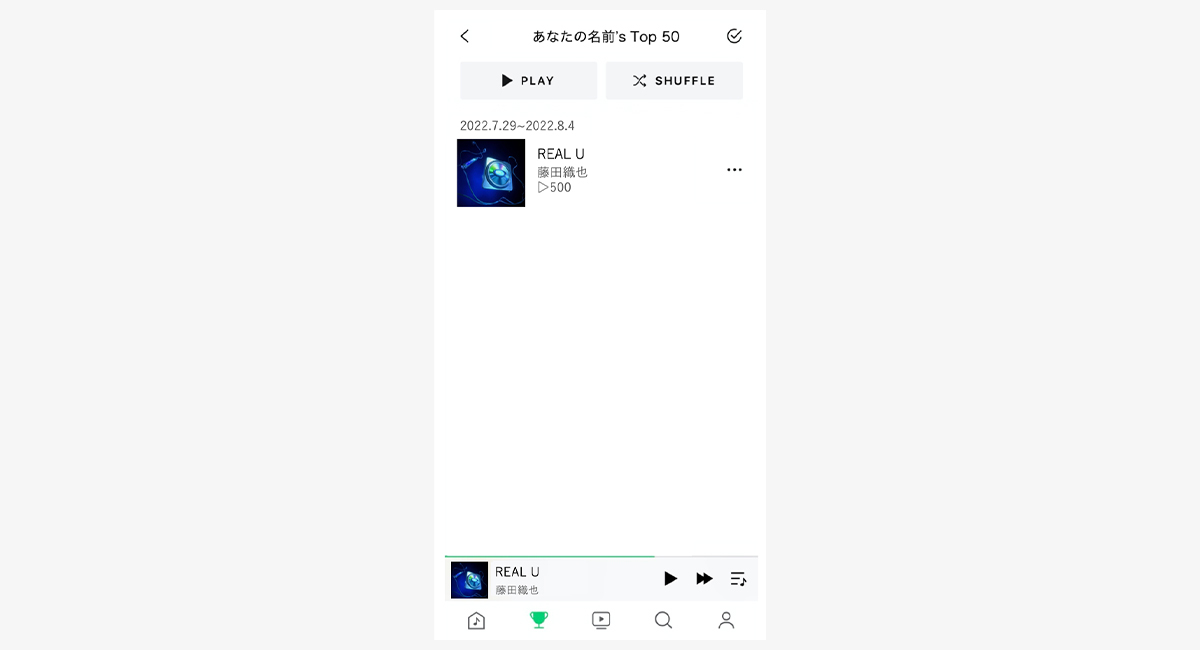 ※「(あなたのお名前)’s Play TOP 50」とは?直近3ヶ月間で自分が再生した楽曲を再生数が多い順に表示したリストです。
