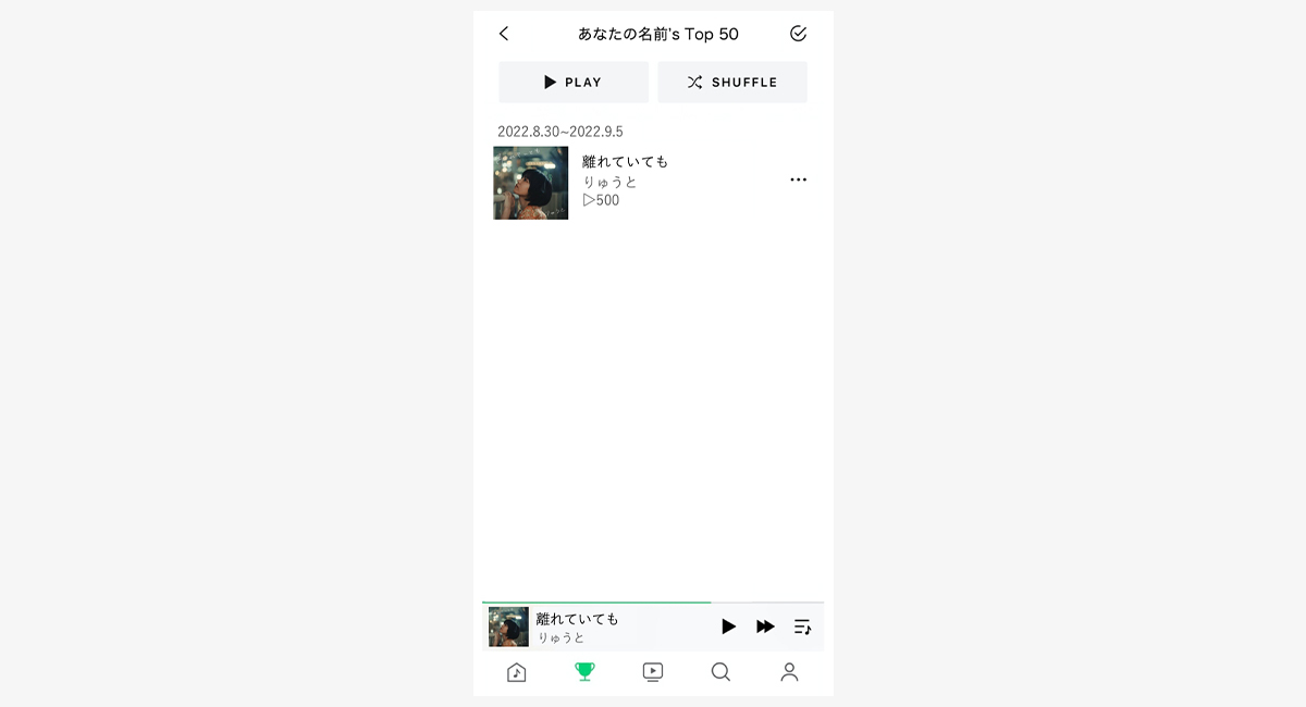 ※「(あなたのお名前)’s Play TOP 50」とは?直近3ヶ月間で自分が再生した楽曲を再生数が多い順に表示したリストです。