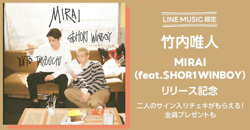竹内唯人の新曲「MIRAI (feat. $HOR1 WINBOY)」をLINE MUSICアプリで期間中にたくさん聴いた方の上位3名様に、竹内唯人と$HOR1 WINBOYのサイン入りチェキが当たります!
