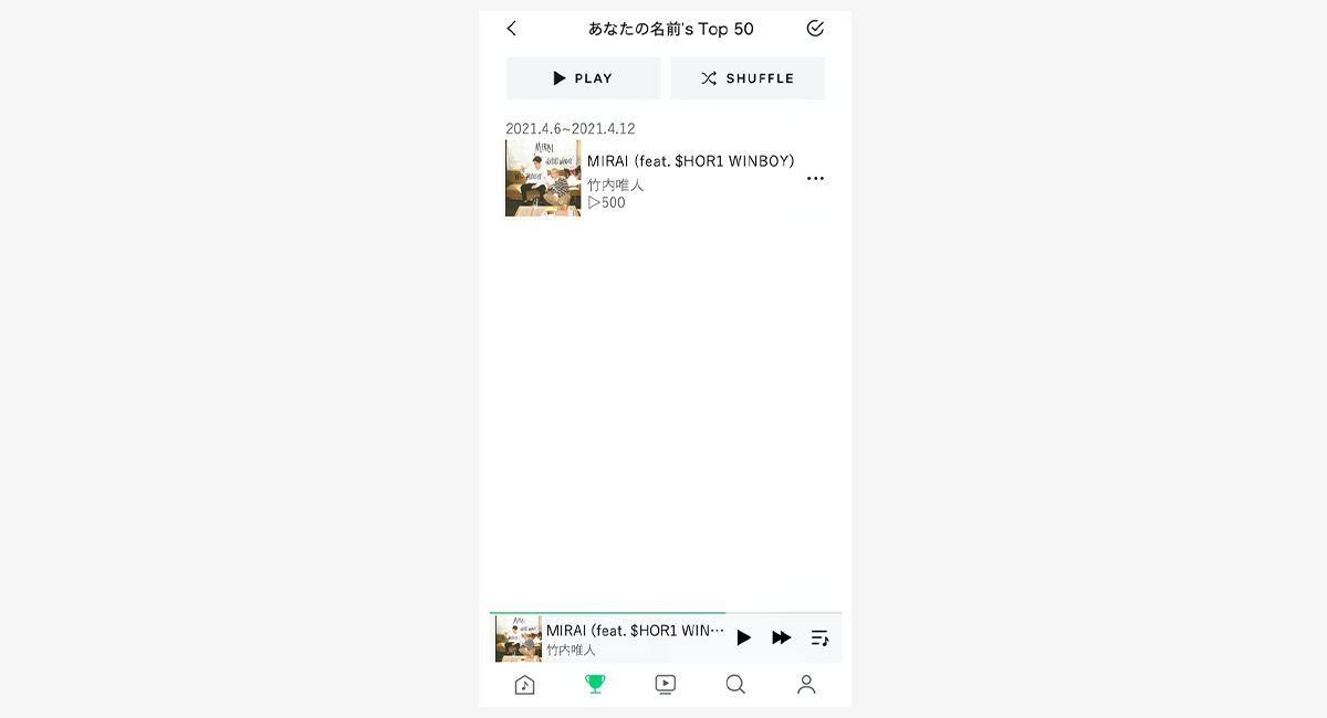 ※「(あなたのお名前)’s Play TOP 50」とは?直近3ヶ月間で自分が再生した楽曲を再生数が多い順に表示したリストです。